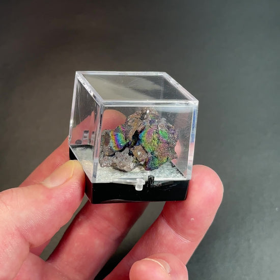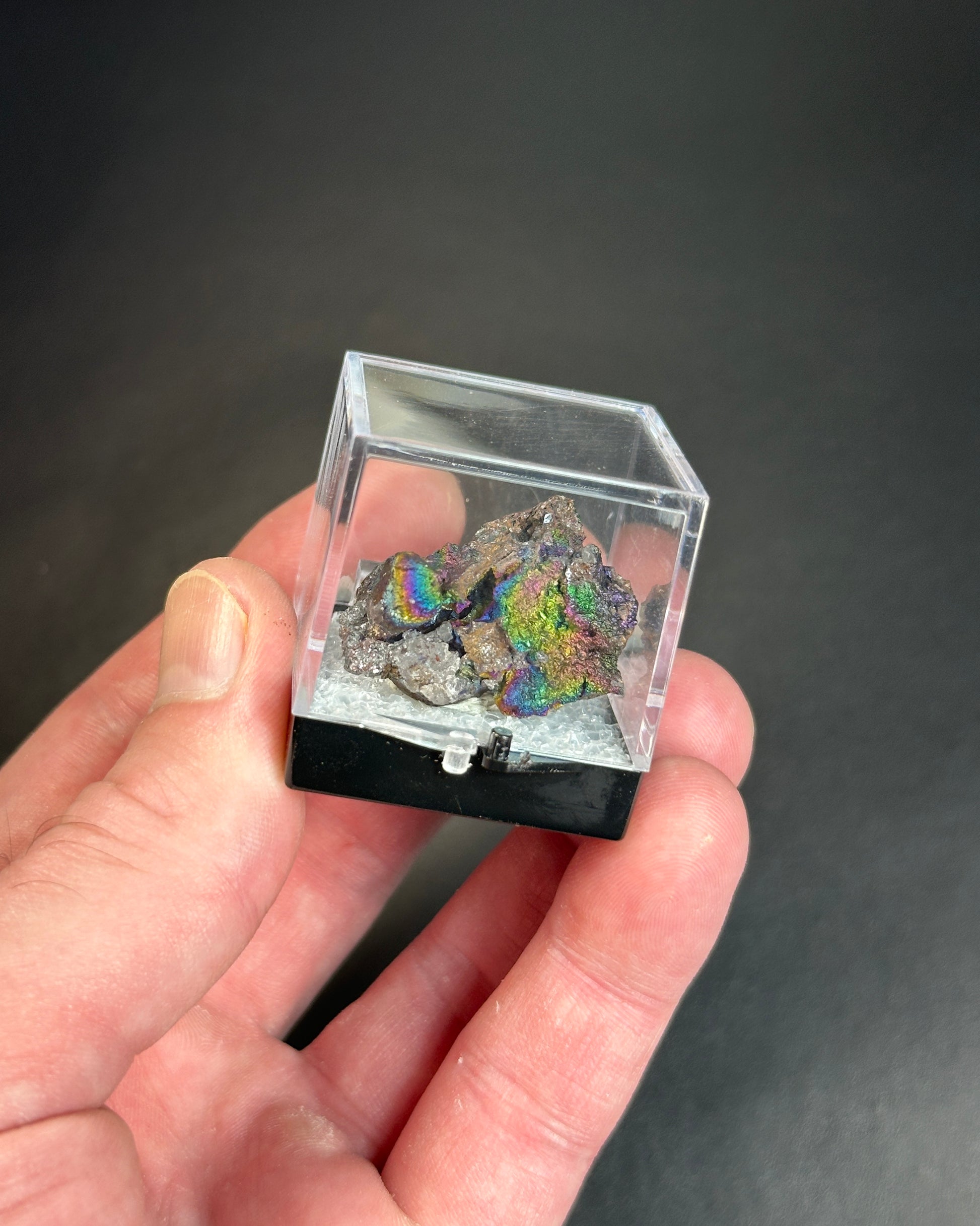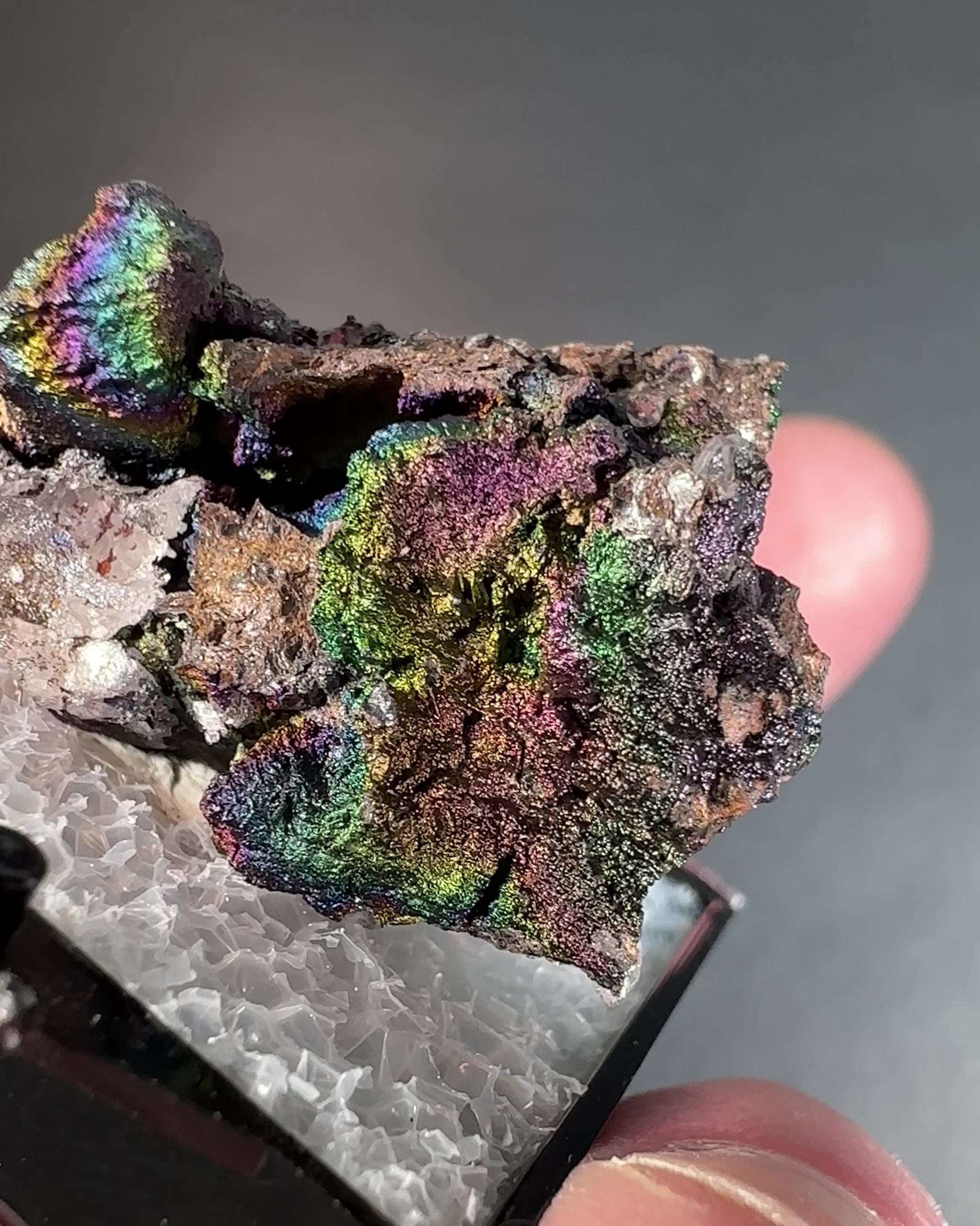 An amazing iridescent hematite and goethite coated quartz specimen that I found. The colors are 100% natural... NO chemical treatment... just washed with water. I love the little rainbow cave. Some of the colors get darker or completely change when exposed to moisture. This can be achieved by breathing on it, or talking to it if you prefer, and it will slowly change back.