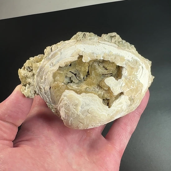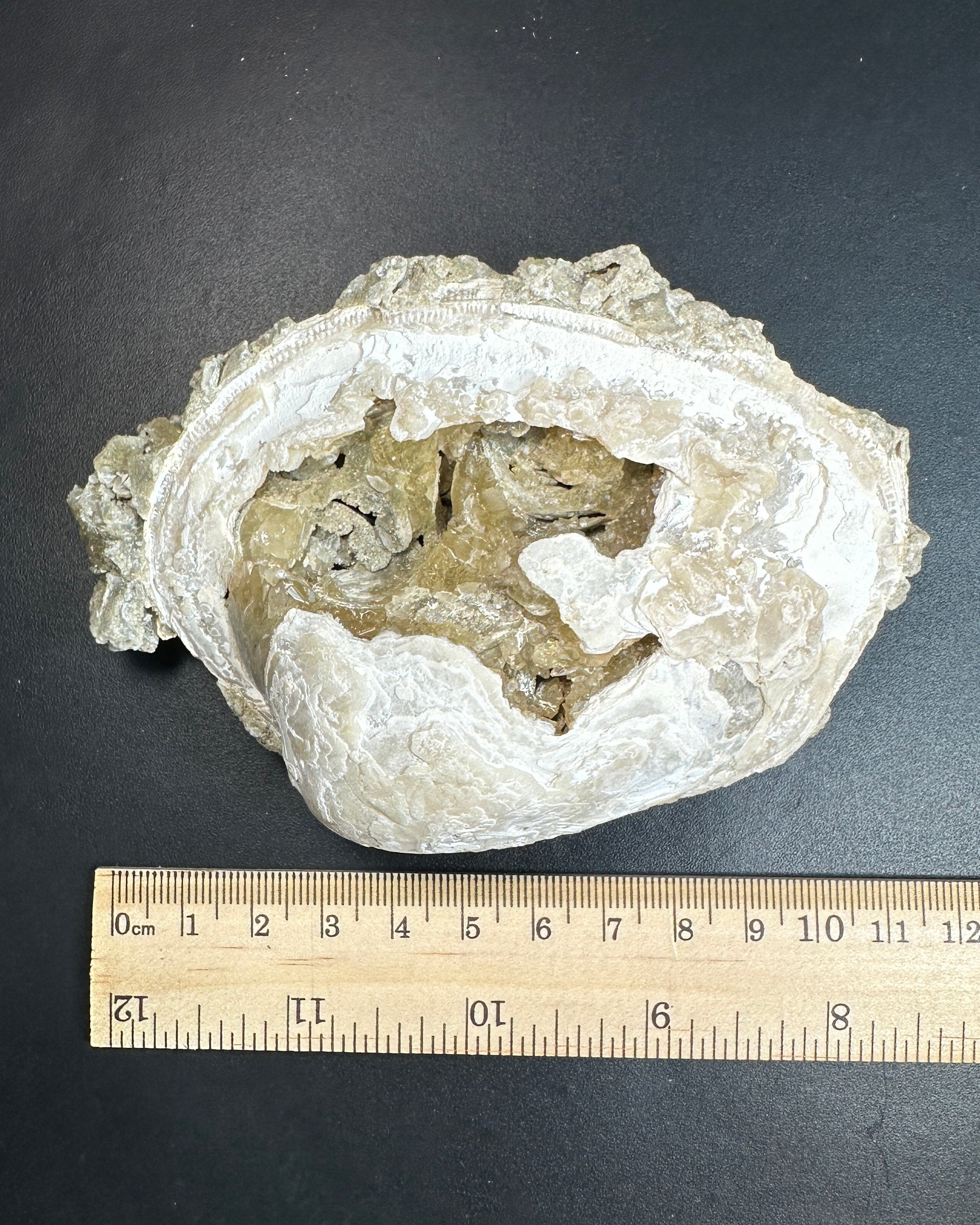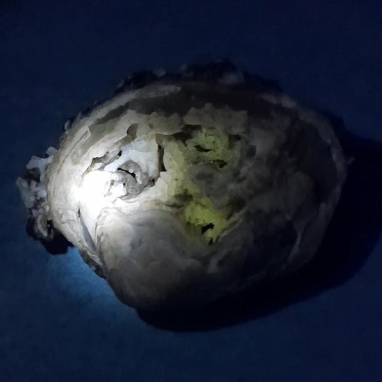 A Mercenaria Permagna clamshell with unusual calcite growth inside of it. There are some dogtooth crystals, and all the calcite and calcified portions of the shells fluoresce and phosphoresce very strongly under longwave UV.