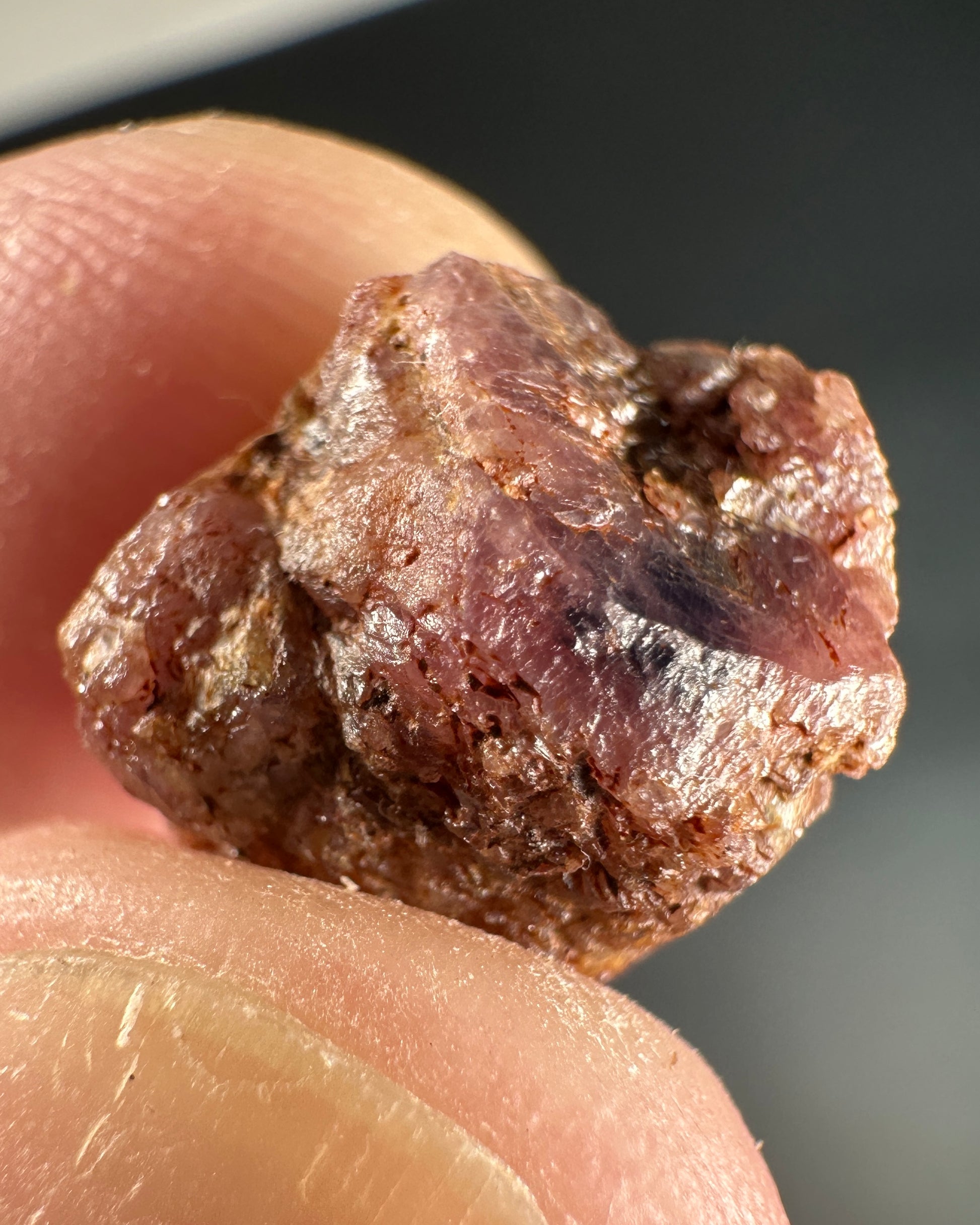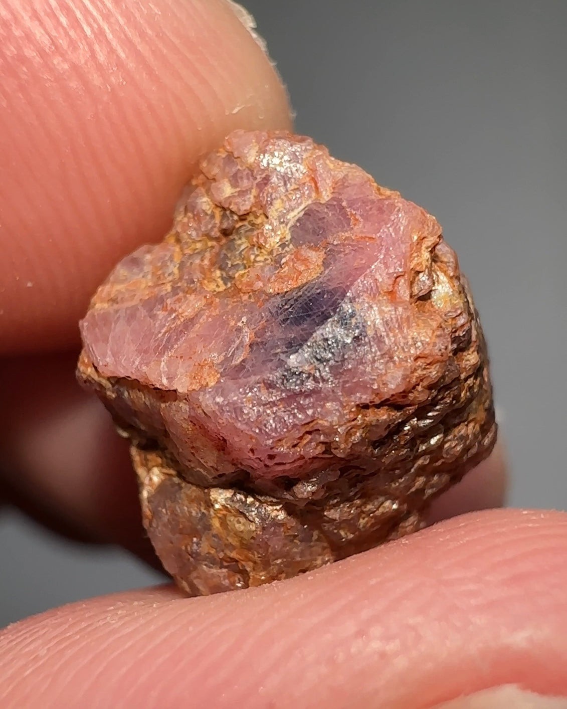 A nice little corundum crystal from Propst Farm in North Carolina. It has gotten incredibly difficult to find these as the property haa been dug and redug for years. The first corundum crystal was found here by a farmer and was brought to a local jeweler to find out what it was. It's kind of crazy finding rubies (reddish corundum) and sapphires (all the other colors) in a small town neighborhood built on farmland. This crystal is a combination of them both and, better yet, it's highly fluorescent under longwave UV.